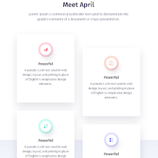 April - хороший, адаптивный landing, выполненный в светлых тонах с приятной анимацией. Этот landing отлично подойдет для тех, кому нужны красивые, отзывчивые компоненты для своих проектов.